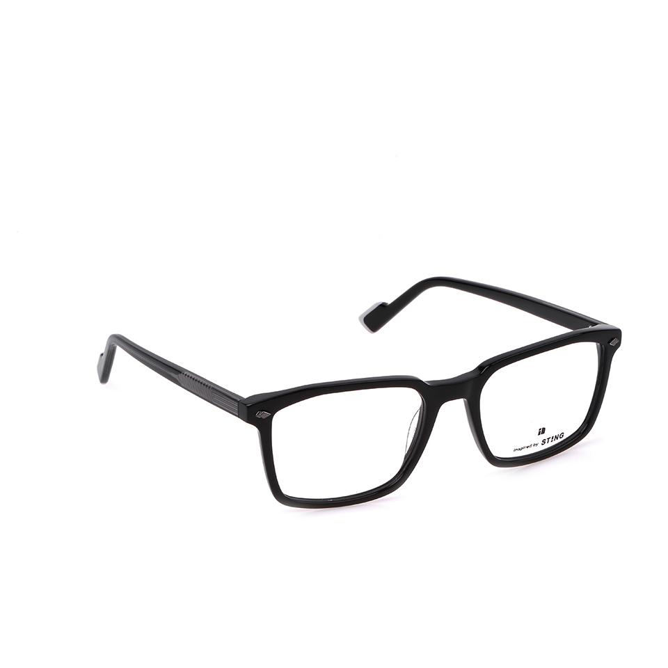 Gafas de vista de acetato con forma clásica rectangular. Disponibles en dos versiones caracterizadas por encolados especiales en el frente con colores contrastantes y texturas originales. La versión de color U11 combina un frente de color sólido y varillas habana. La orla metálica de los talones, el núcleo metálico visible de la varilla y el terminal especial con forma de espátula son los elementos distintivos de la colección IN Inspired by STING.