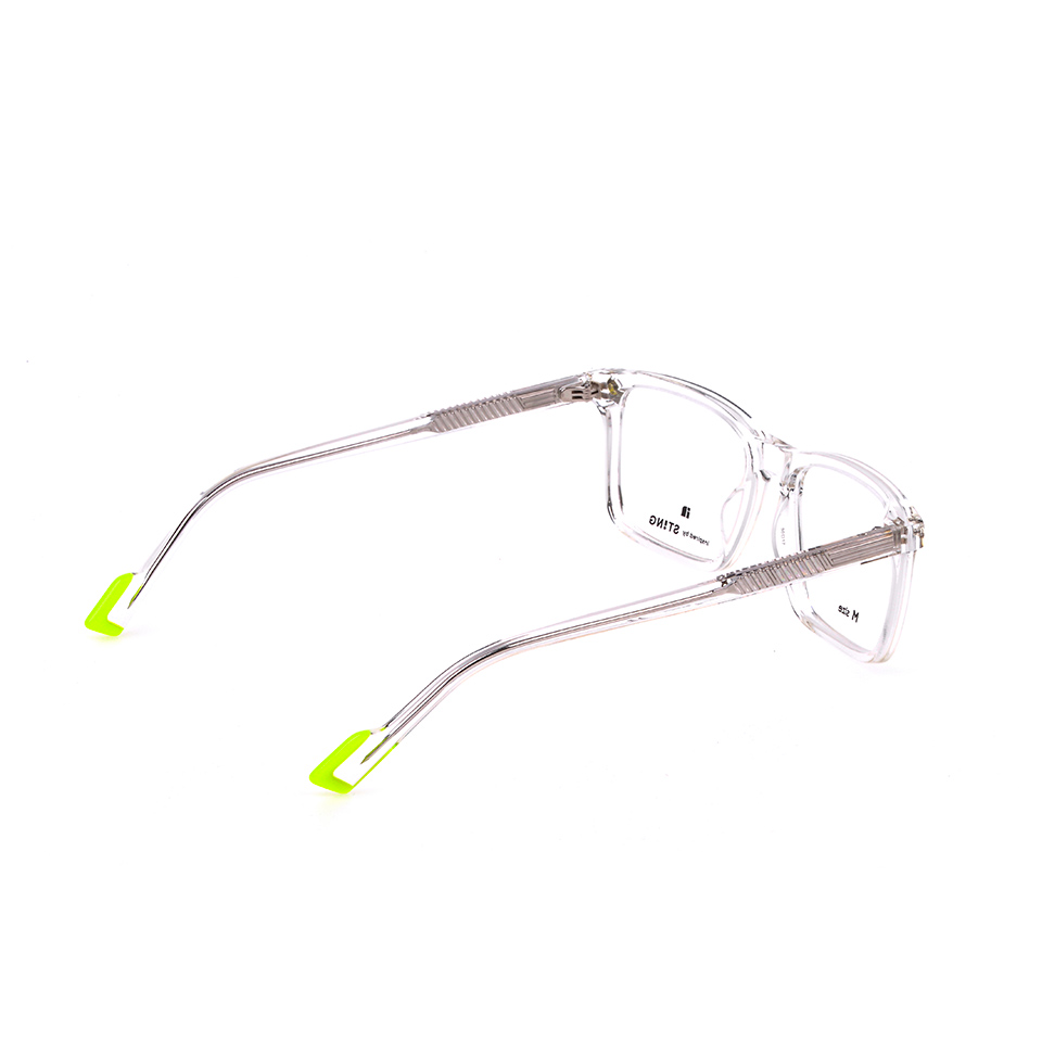 Gafas de vista de acetato con forma rectangular. Versión del modelo VST508, desarrollada para rostros menudos. Disponible en dos colores sólidos y dos transparentes. El terminal de la varilla con forma de espátula es el elemento distintivo de la colección IN Inspired by STING. Bisagra de cinco articulaciones y núcleo metálico visible.