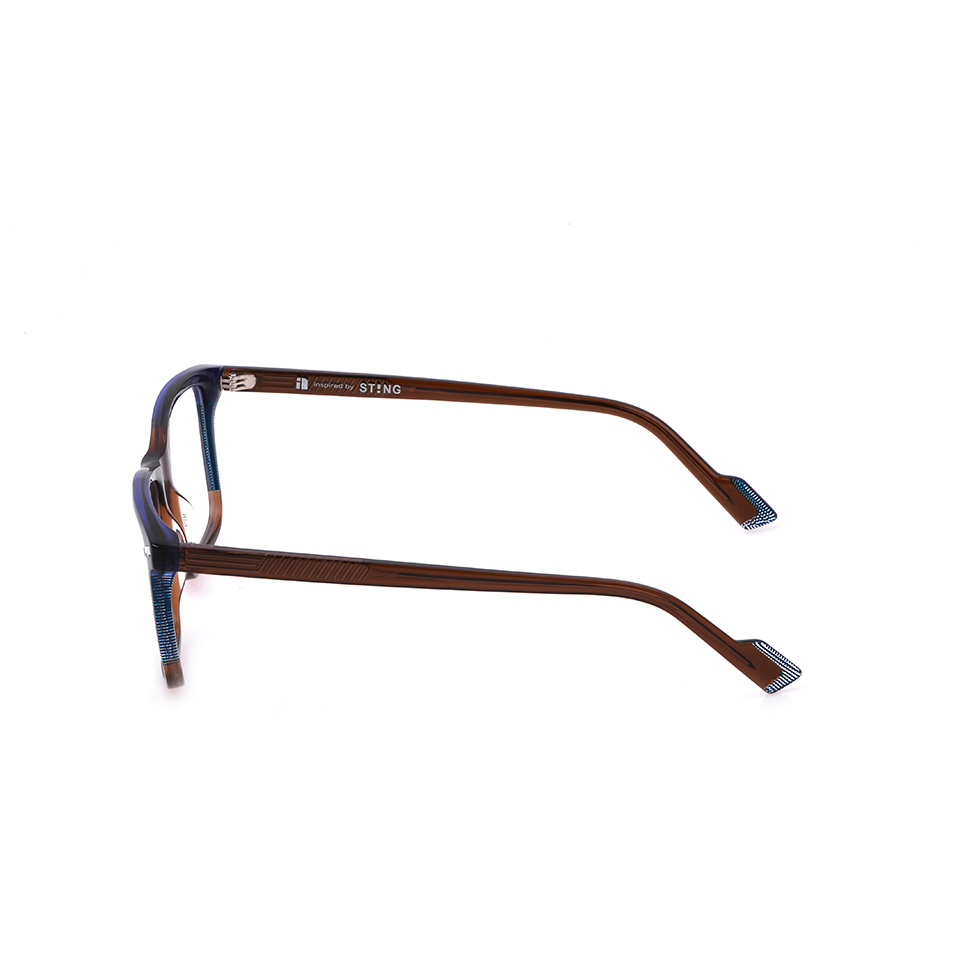 Gafas de vista de acetato con forma rectangular. Disponible en dos colores sólidos y dos colores caracterizados por unos encolados especiales en el frente. El terminal de la varilla con forma de espátula es el elemento distintivo de la colección IN Inspired by STING. Bisagra de cinco articulaciones y núcleo metálico visible.