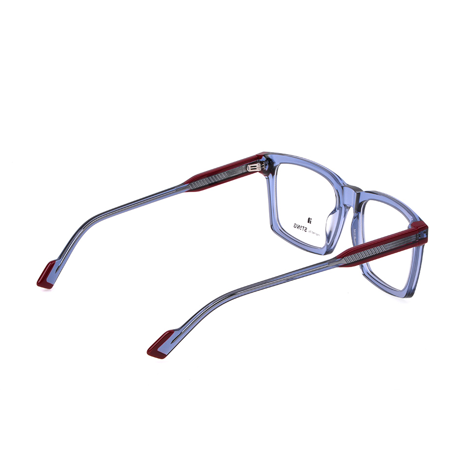 Gafas de vista de acetato con forma rectangular. La parte superior del frente se caracteriza por un facetado distintivo. Bisagra de cinco articulaciones y núcleo metálico visible. En el terminal, la varilla con forma de espátula y su encolado especial crea un efecto contrastante: la firma de la colección IN Inspired by STNG.