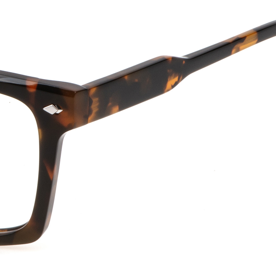 Gafas de vista de acetato con forma rectangular. La parte superior del frente se caracteriza por un facetado distintivo. Bisagra de cinco articulaciones y núcleo metálico visible. En el terminal, la varilla con forma de espátula y su encolado especial crea un efecto contrastante: la firma de la colección IN Inspired by STNG.