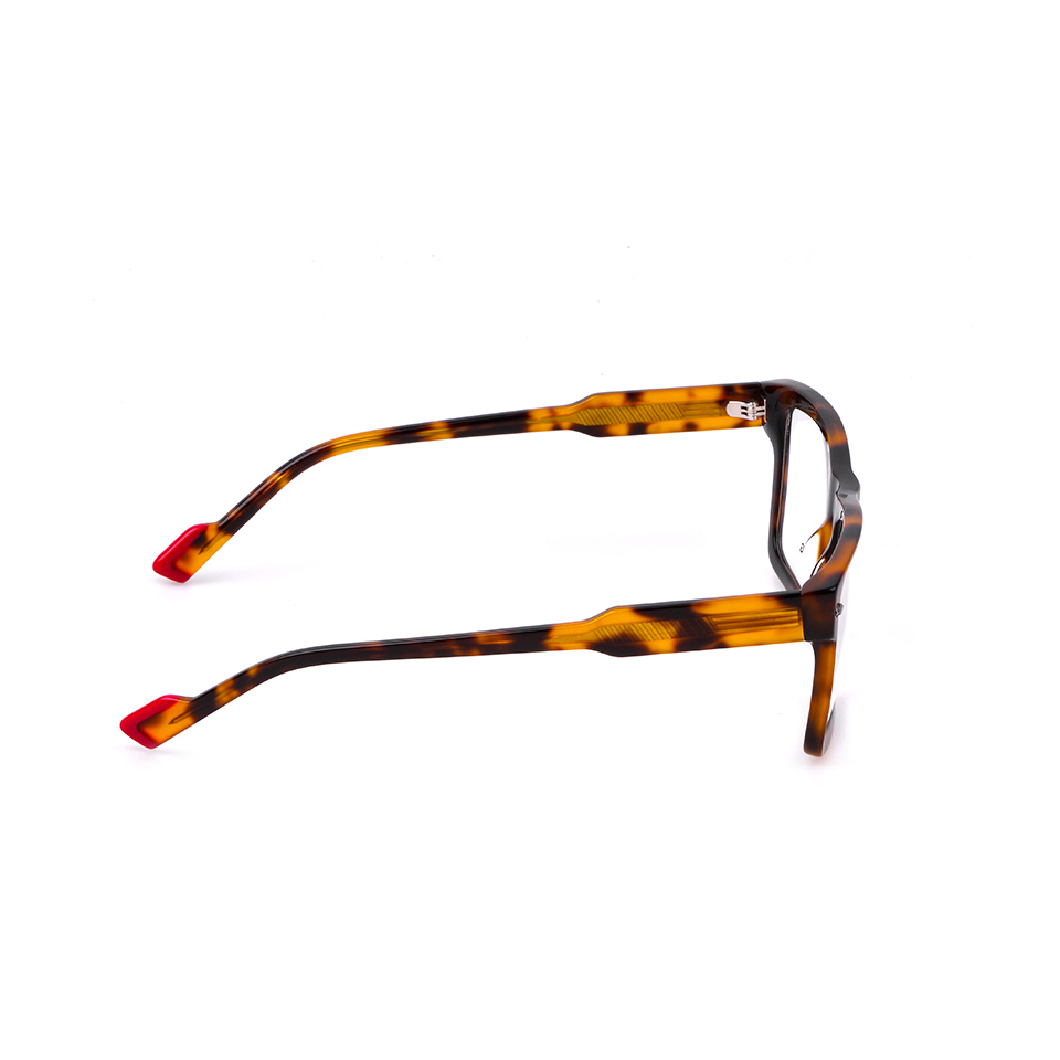 Gafas de vista de acetato grueso con forma rectangular. El frente facetado caracteriza el frente del modelo VST504. Bisagra metálica especial de 5 articulaciones para un máximo confort. El terminal de la varilla con forma de espátula es un elemento distintivo de la colección IN Inspired by STING.