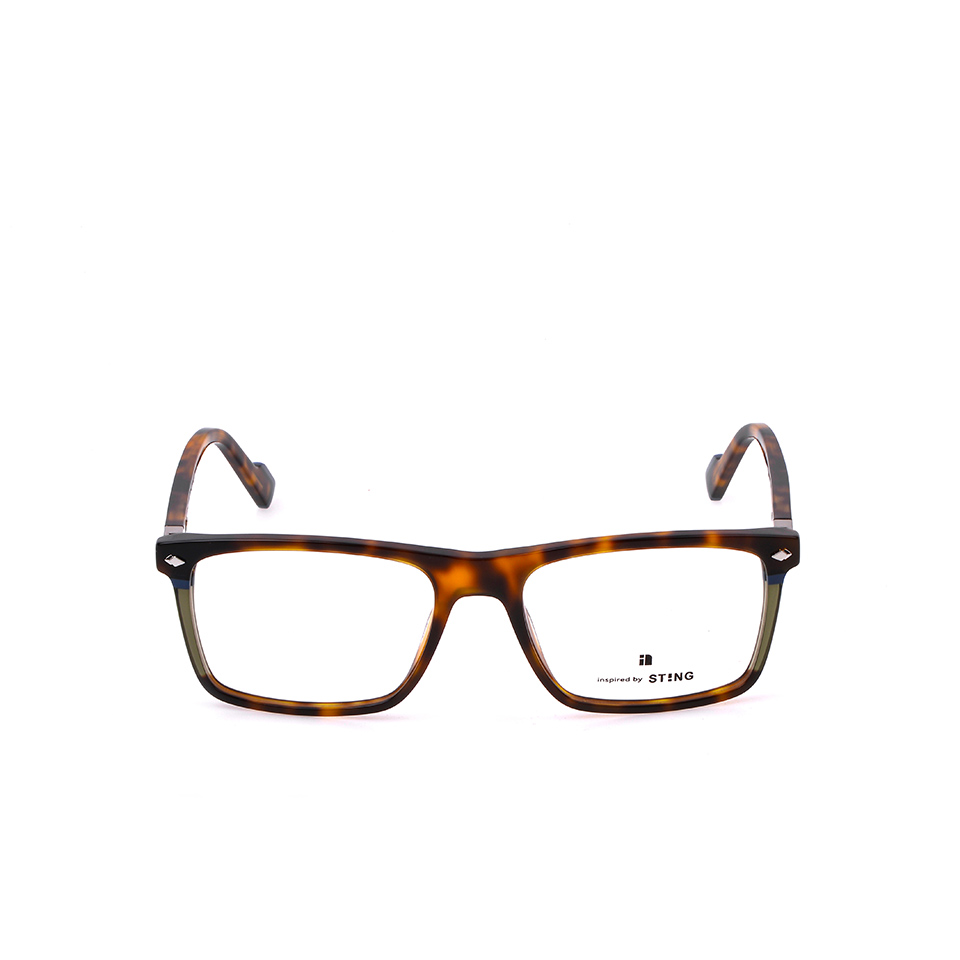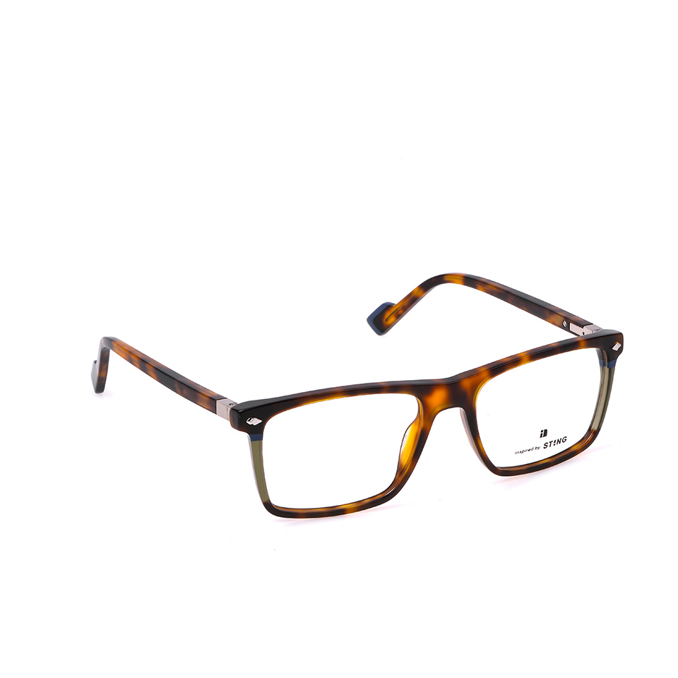 Gafas de vista de acetato con forma rectangular, delgadas y ligeras. Tres versiones de color caracterizadas por encolados especiales en el frente. El terminal con forma de espátula y la orla metálica del frente son los elementos distintivos de cada modelo IN Inspired by STING.