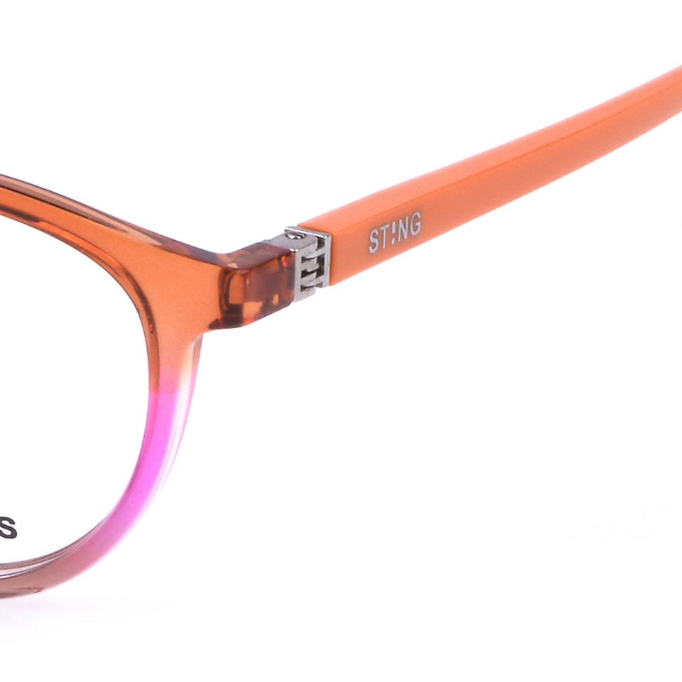 Gafas infantiles de acetato con forma redonda y perfiles finos y ligeros. El frente presenta dos bandas de colores, una de las cuales se repite en las varillas. La bisagra exterior tiene cinco articulaciones. El logotipo STING XS grabado en el interior de la varilla derecha y el logotipo STING en el exterior de ambas varillas. Un detalle llamativo en la punta de la varilla: un cuadrado metálico, reinterpretación del signo de exclamación del logotipo de la marca.