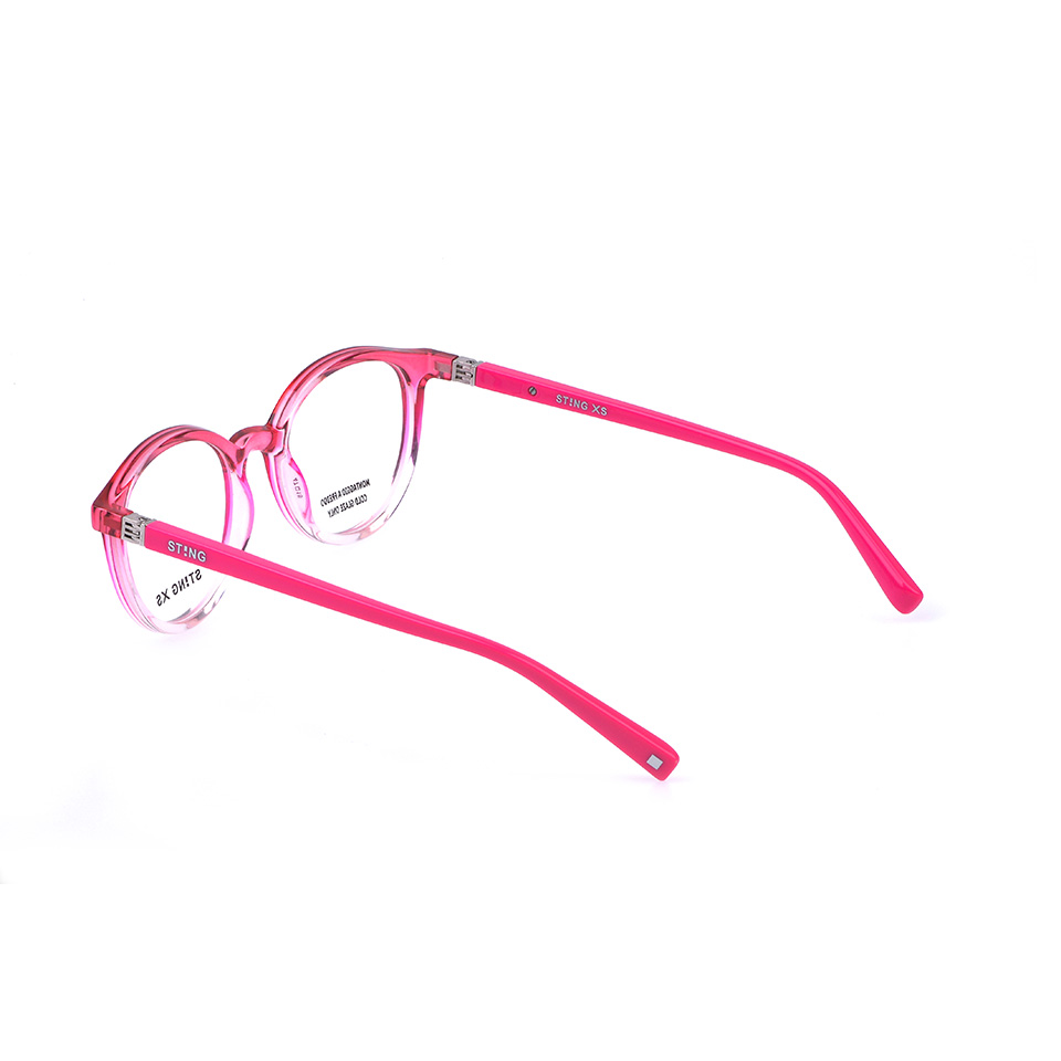 Gafas infantiles de acetato con forma redonda y perfiles finos y ligeros. El frente presenta dos bandas de colores, una de las cuales se repite en las varillas. La bisagra exterior tiene cinco articulaciones. El logotipo STING XS grabado en el interior de la varilla derecha y el logotipo STING en el exterior de ambas varillas. Un detalle llamativo en la punta de la varilla: un cuadrado metálico, reinterpretación del signo de exclamación del logotipo de la marca.