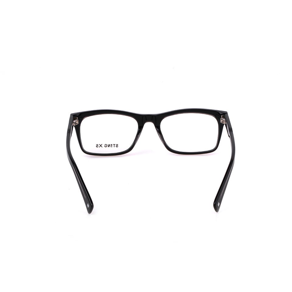 Gafas de vista infantiles hechas de acetato con forma rectangular. El modelo VSJ733 se caracteriza por sus gruesos perfiles, aligerados por una combinación especial de colores sólidos y transparentes en el frente. La elaboración del núcleo metálico, siempre visible, termina con un rectángulo también de metal: es el signo de exclamación del logotipo de Sting.