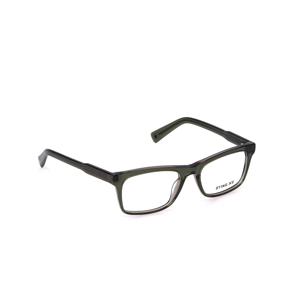 Gafas de vista infantiles hechas de acetato con forma rectangular. El modelo VSJ733 se caracteriza por sus gruesos perfiles, aligerados por una combinación especial de colores sólidos y transparentes en el frente. La elaboración del núcleo metálico, siempre visible, termina con un rectángulo también de metal: es el signo de exclamación del logotipo de Sting.