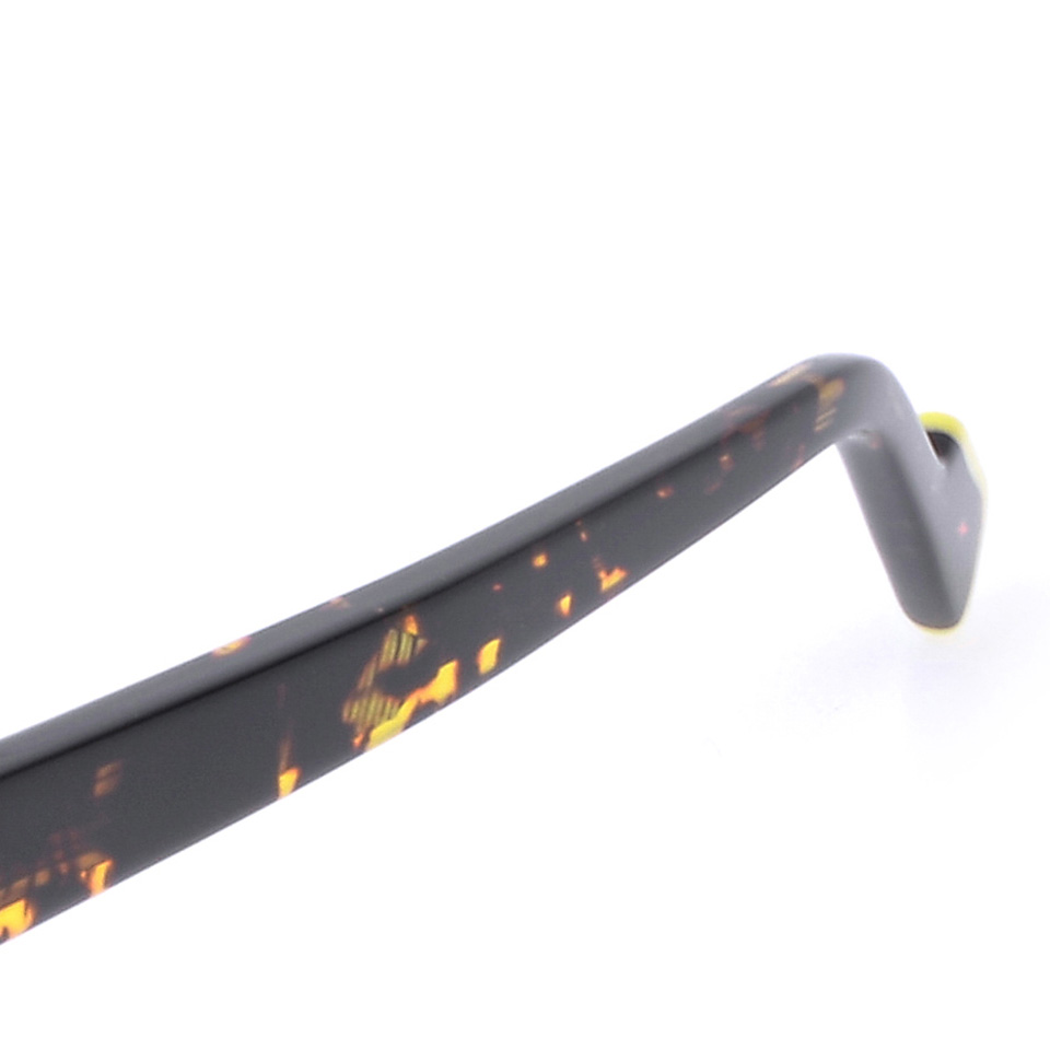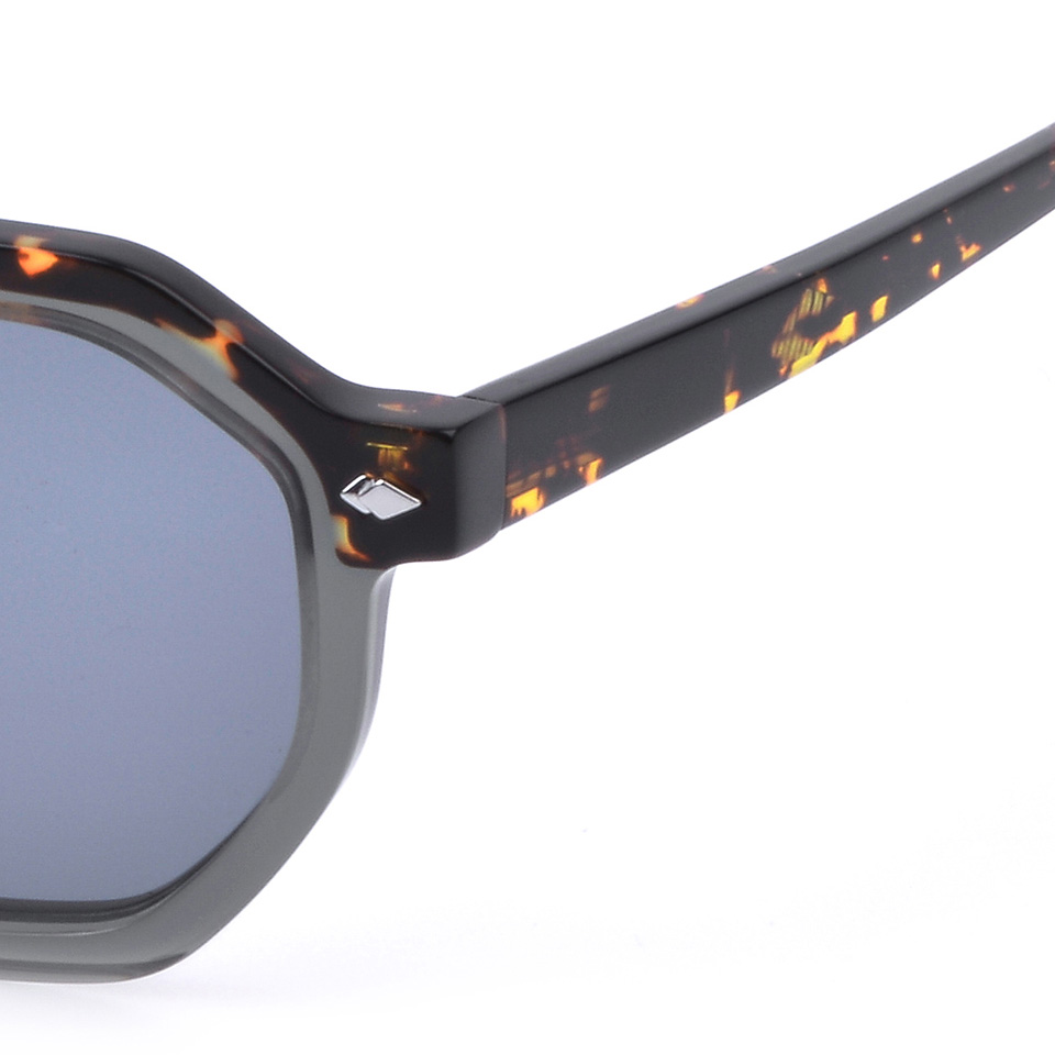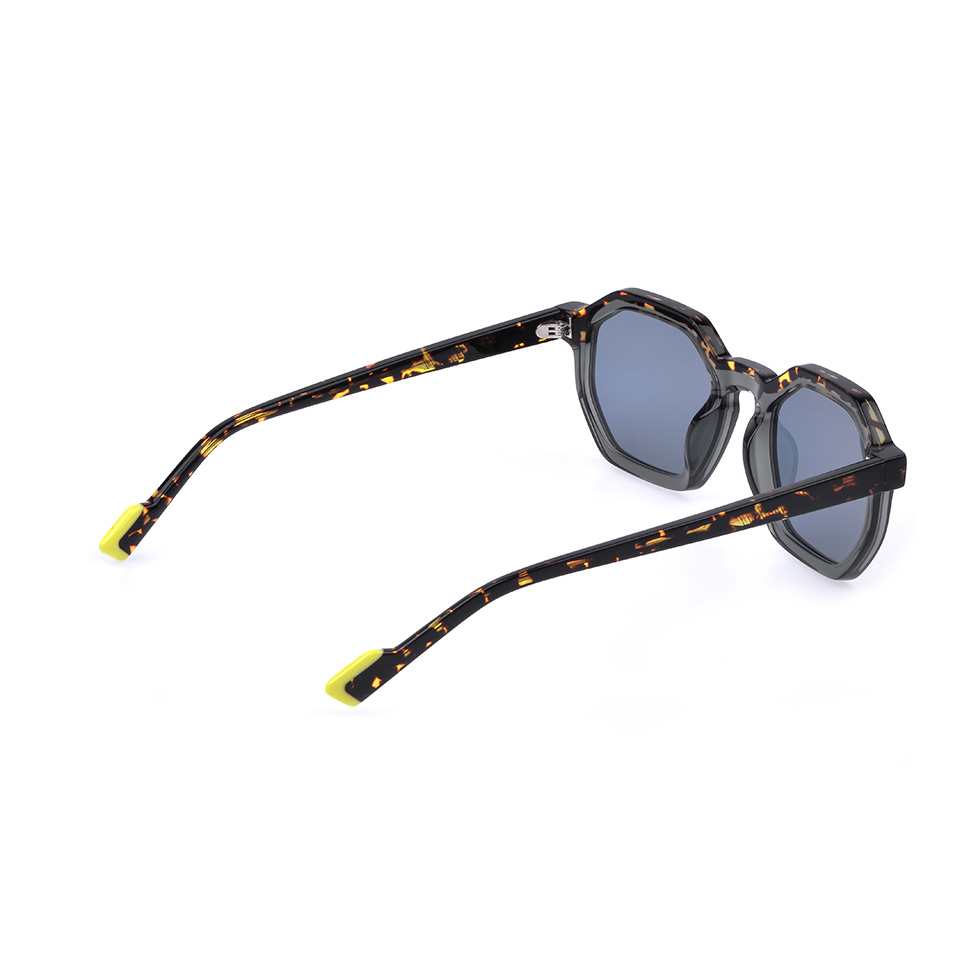 Gafas de sol de acetato con forma geométrica y llamativas texturas. Un punto de color adicional, en perfecto IN inspirado en el estilo STING, se encuentra en las puntas de las varillas: una unión especial que crea el icónico efecto contrastante.