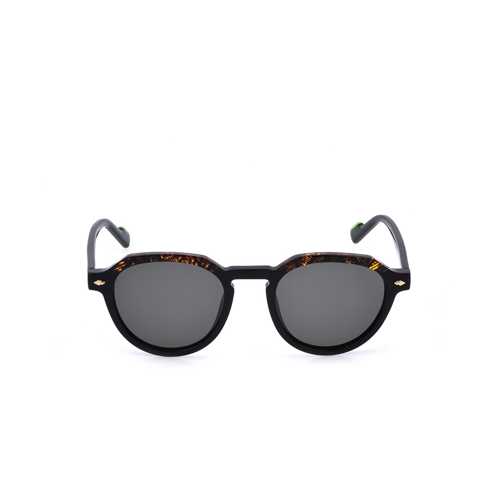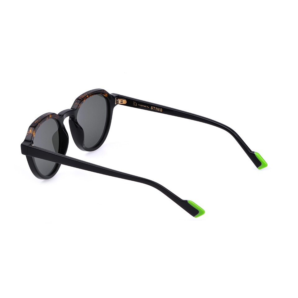 Gafas de sol de acetato con la clásica forma pantos. Diferentes texturas y colores caracterizan las distintas versiones del modelo. Un punto más de color, en perfecto IN inspirado en el estilo STING, se encuentra en los terminales de las varillas: una unión especial que crea el icónico efecto contrastante.